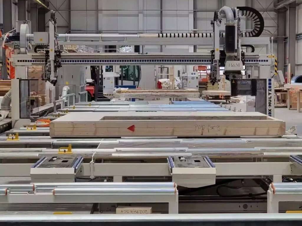 Stół roboczy nr 6 służy do formatowania konstrukcji stropów. Po zbiciu ramy, prefabrykat zostaje przesunięty na stół nr 2 linii w celu poszycia płyty OSB z użyciem mostu CNC.
